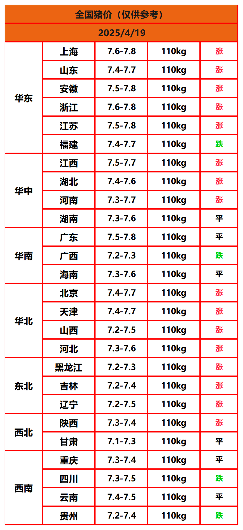 2025年4月19日猪价,今日全国猪价行情走势:16涨6平4跌。