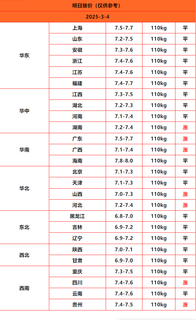 2025年3月4日猪价,今日全国猪价行情走势:7涨19平0跌。