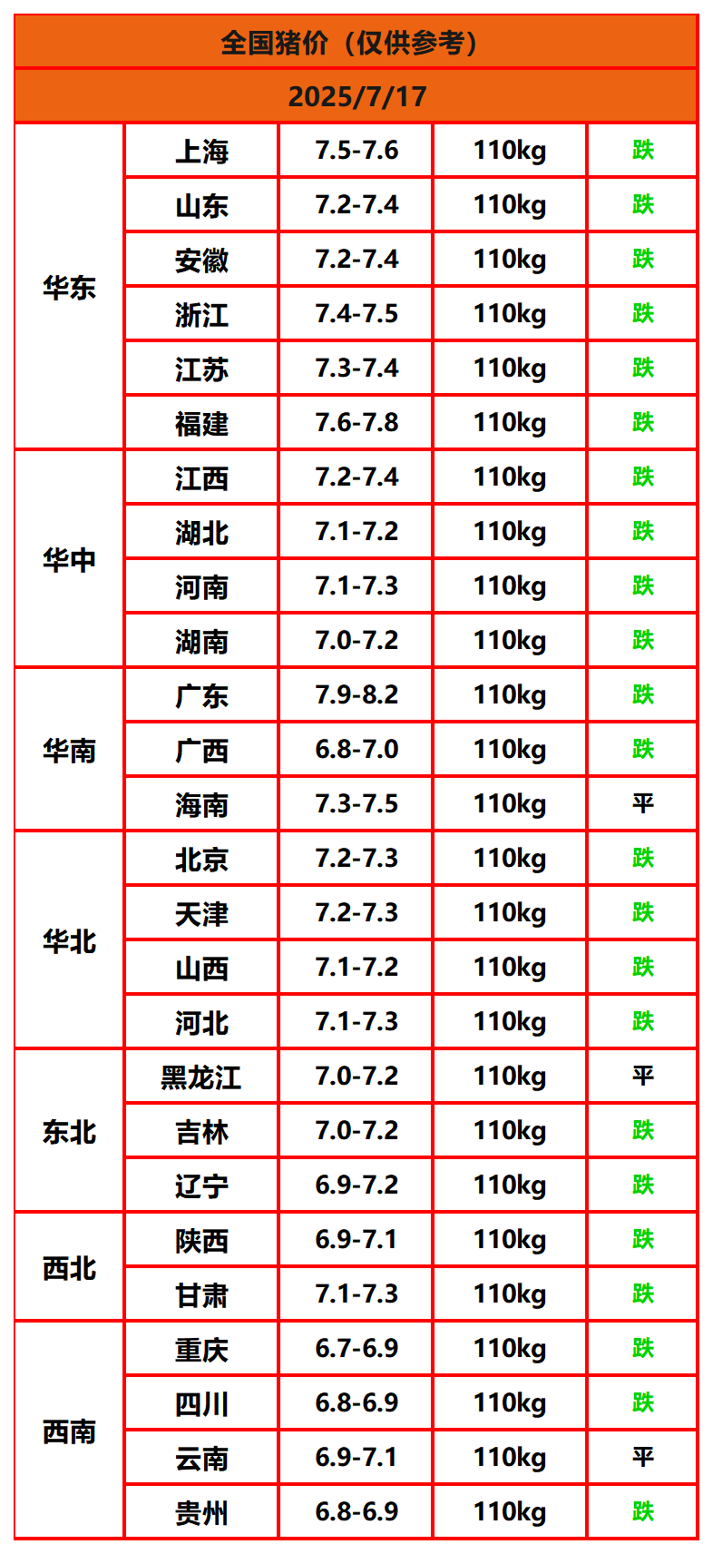 2025年7月17日猪价,今日全国猪价行情走势:0涨3平23跌。